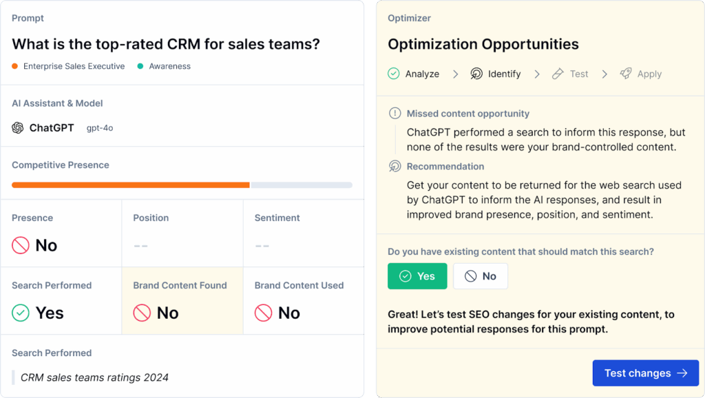 Vista de optimización — recomendaciones de contenido para mejorar visibilidad en IA